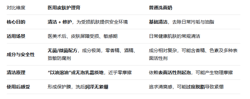 医用皮肤护理膏是用于【皮肤屏障受损期】的“修护型清洁品”,而普通洗面奶是用于【健康皮肤】的“日常清洁品”。