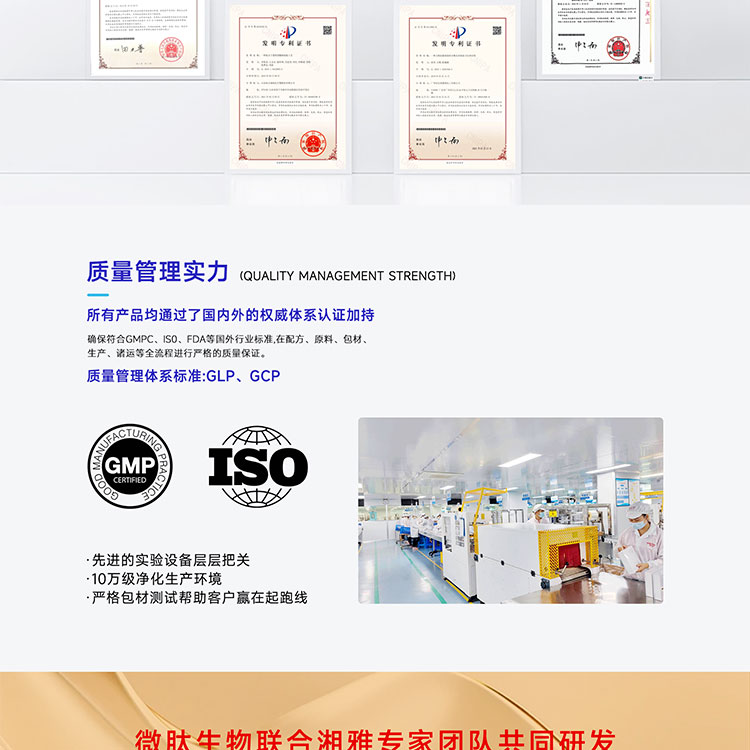 微肽生物与暨南大学、湖南湘雅医学院、南方医科大学、安徽医科大学等四大高校建立了战略研发合作。拥有近百项授权专利,覆盖新型生物材料、活性成分及高分子载体技术等关键领域,并自主开发出小分子肽、高纯度胶原蛋白、贻贝粘蛋白等高活性原料。这一完整的技术闭环不仅构建了坚实的知识产权护城河,更赋予产品以权威的学术背书和显著的合规优势,为品牌提供了强有力的市场信任基石。