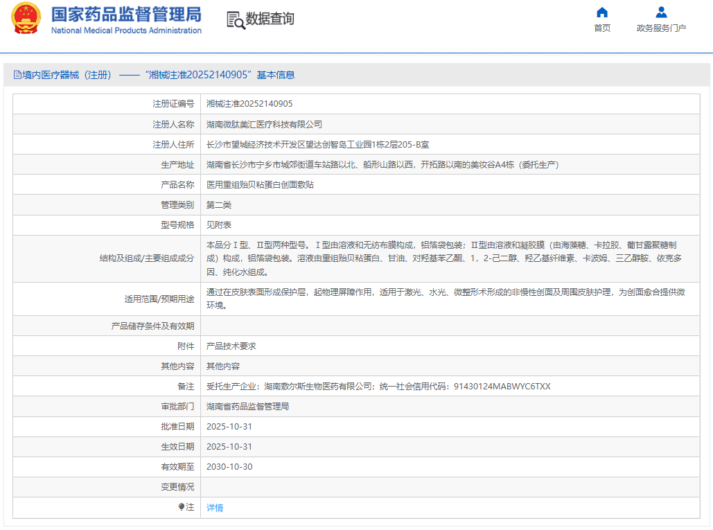 近日,微肽生物旗下子公司——湖南微肽美汇医疗科技有限公司,自主研发的医用重组贻贝粘蛋白创面敷贴(注册证编号:湘械注准20252140905)成功获得国家药品监督管理局颁发的二类医疗器械注册证,标志着该企业在生物医药领域的创新实力再获权威认可,为创面修复市场注入新的活力。