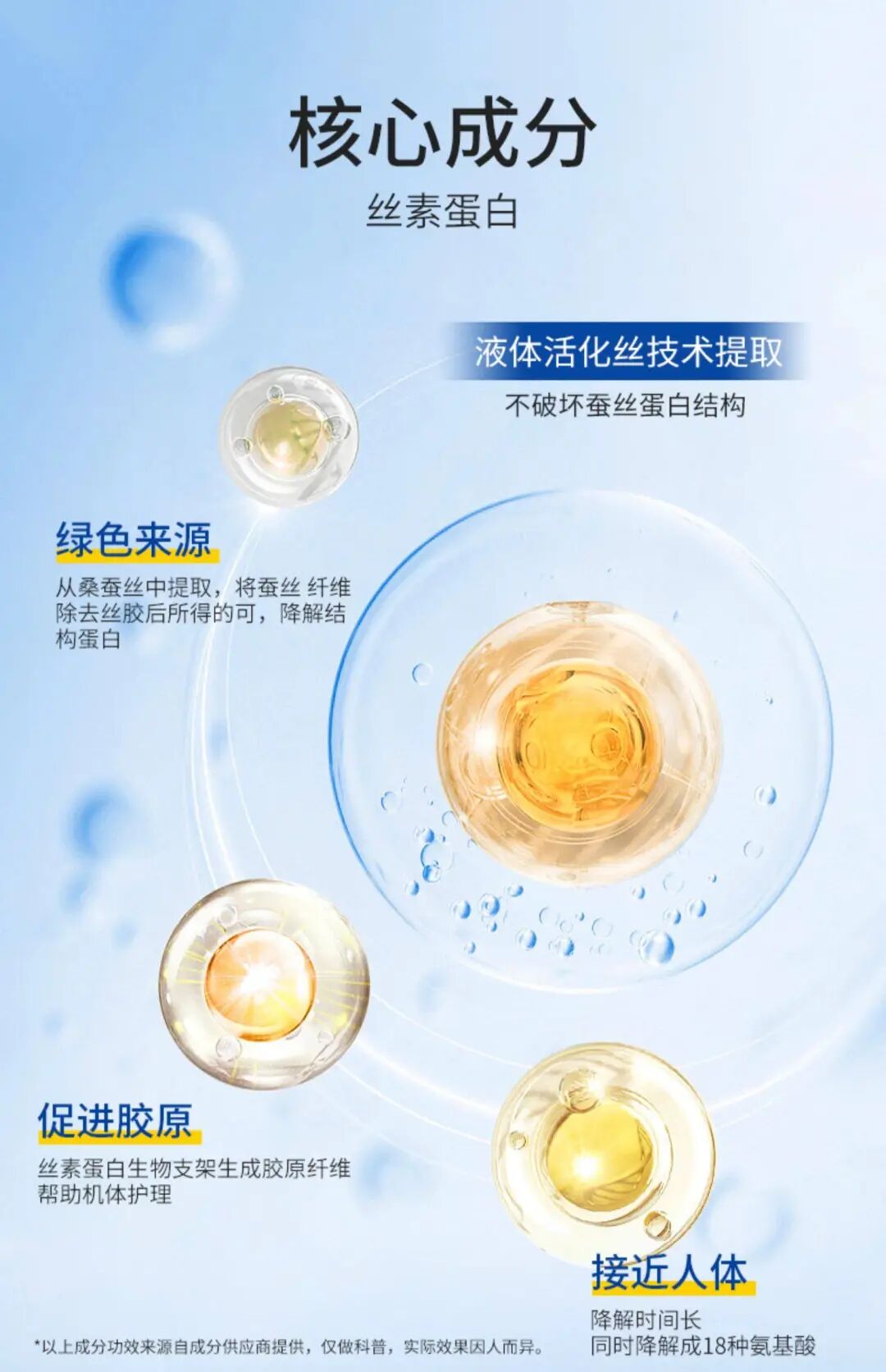 丝素蛋白是从蚕丝中提取的天然结构性蛋白,是蚕丝的主要组成部分,是以甘氨酸、丙氨酸、丝氨酸为主要氨基酸序列的天然高分子纤维蛋白。