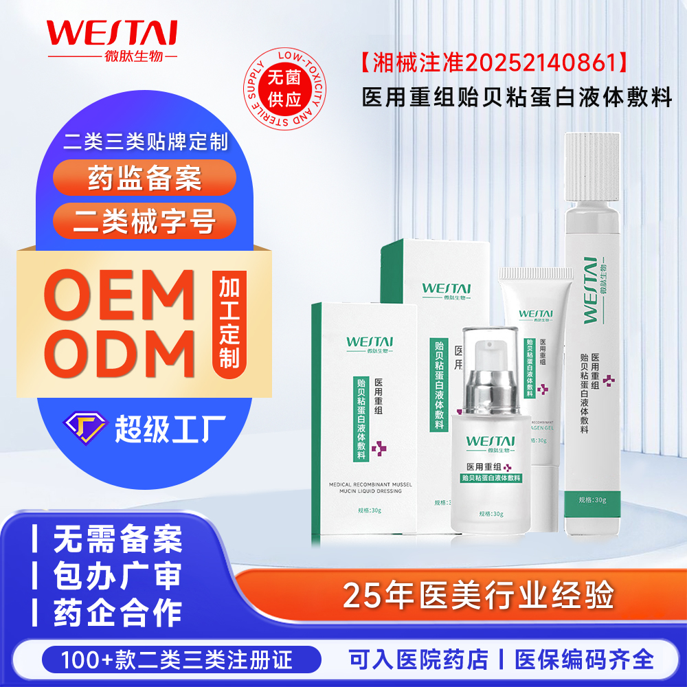 选择微肽生物进行医用重组贻贝粘蛋白液体敷料OEM/ODM代工,即是选择了从核心原料到合规上市的全链条专业保障。作为国家级高新技术企业,微肽生物依托与暨南大学共建的联合实验室及湘雅博士团队领衔的研发实力,在重组贻贝粘蛋白领域拥有基因工程技术优势,可实现高纯度、高活性规模化生产。